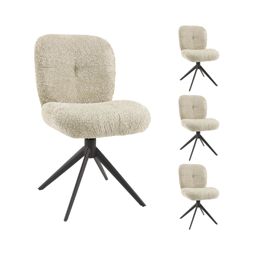 Pour accompagner cette table, six chaises pivotantes en tissu bouclette sable viennent adoucir l’atmosphère avec leurs textures moelleuses et leur silhouette fluide. Le revêtement en polyester bouclé est doux au toucher, agréable à l’œil, et facile à intégrer dans différents styles d’intérieur. Le piètement en acier noir apporte contraste et caractère tout en assurant un maintien fiable. Leur fonction pivotante ajoute une souplesse bienvenue à l’usage quotidien.